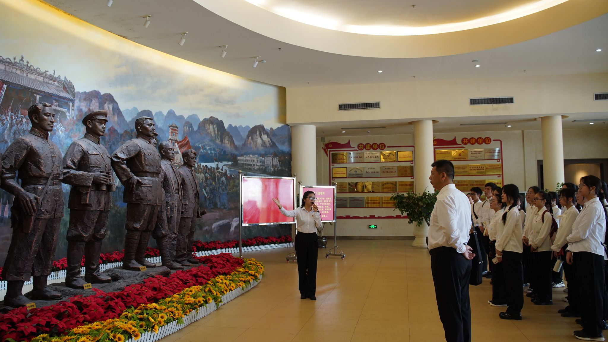 活动伊始,在庄严的国歌声中,全体人员肃立,向烈士纪念碑敬献鲜花,以表达对烈士们的崇高敬意和深切缅怀之情。随后,在讲解员的细致引导下,同学们逐一参观了新民主主义革命、土地革命、抗日战争、解放战争四个时期的广西革命史展厅。在讲解员生动的解说下,同学们仿佛穿越历史长河,亲身感受了广西军民在中国共产党的领导下,英勇奋战、不畏牺牲的壮丽历史画卷。