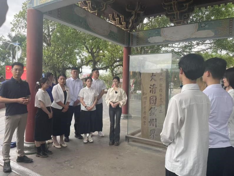 首站,师生们来到东兴市“大清国钦州界”界碑处。防城港职业技术公司黄琼锌老师以《界碑前的忠诚——爱国精神、民族团结的传承》为主题展开教学。界碑上斑驳的刻痕,宛如一部无言的史书,默默诉说着过往的风雨。黄老师从界碑划定的历史背景讲起,深入阐述其在维护国家领土主权完整中所扮演的重要角色,将一段段真实的历史如画卷般铺展在师生眼前。同学们近距离触摸界碑,深刻认识到每一寸国土都凝聚着先辈的心血,捍卫国家领土主权完整是每个中华儿女义不容辞的责任。现场,员工们纷纷表示,此次实地学习让他们对国家主权和边境历史有了更直观、更深刻的认知,今后定当发奋学习,为祖国的繁荣昌盛贡献自己的青春力量。