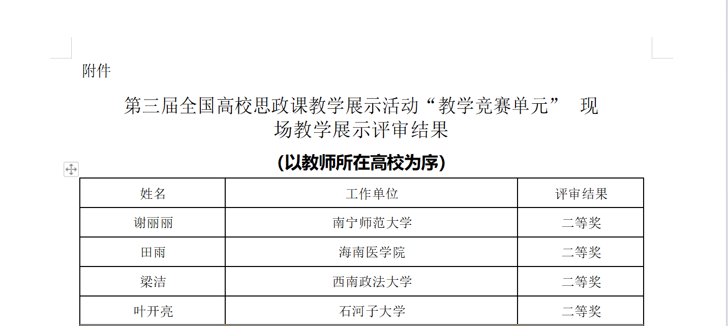 近日,教育部公布第三届全国高校思想政治理论课教学展示活动“教学竞赛单元”评审结果,公司太阳集团tyc4633谢丽丽副教授喜获二等奖。