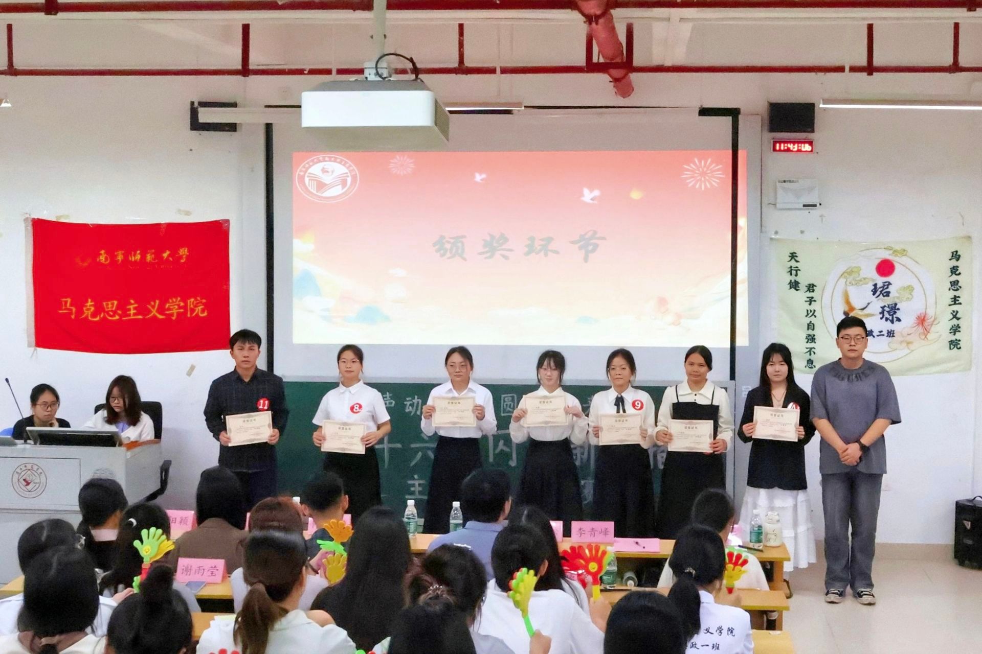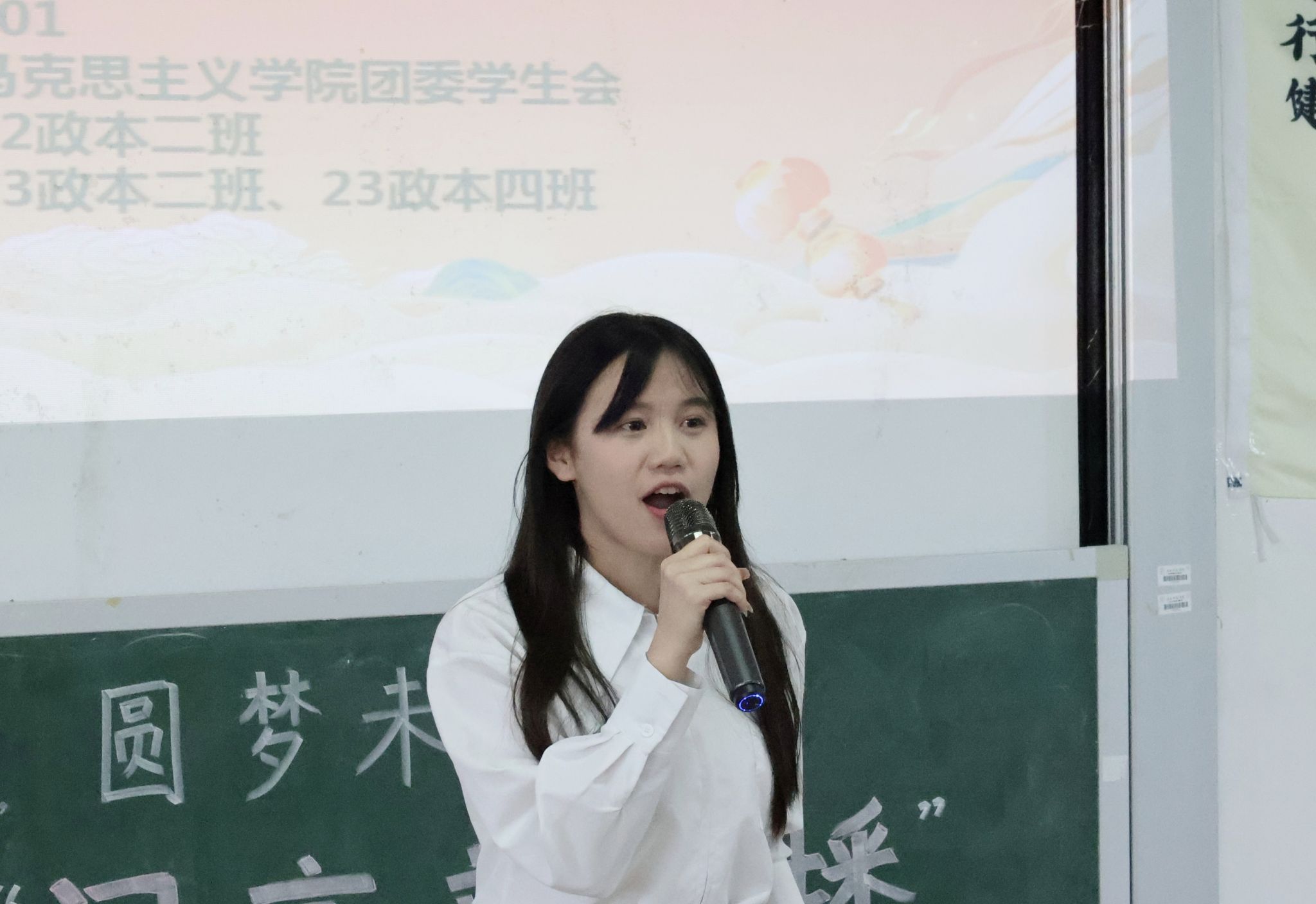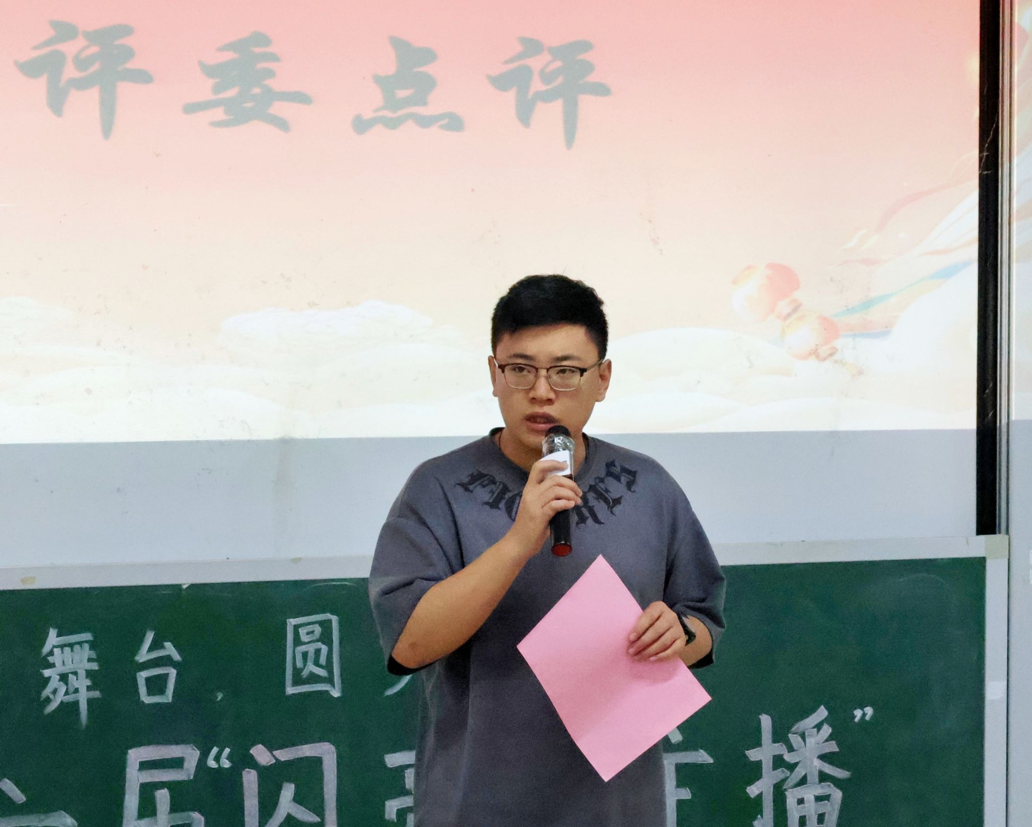 比赛伊始,艺术团成员带来开场节目《找自己》,紧接着白雪松老师作为评委代表发言,他指出,本次大赛的目的在于发掘既有深度理论积累又有实践能力的马院学子,为新时代文化传播注入新的活力,让马克思主义理论能得到进一步传播和普及。比赛过程中,参赛选手首先进行了两分钟的模拟主持,参赛选手们的选题紧跟实时新闻,表达清晰明了。随后,在配音环节中,选手们惟妙惟肖地演绎令人身临其境。在接下来的互动环节中,观众们踊跃参与,现场氛围高涨。在新闻评论的环节中,参赛选手们紧抓时政要点,侃侃而谈。比赛最后,第十五届闪亮新主播冠军韦宇晗、校广播站李青峰以及22政本2班班主任白雪松对选手进行了点评,他们肯定了选手们积极向上的精神风貌与临场发挥的能力,同时也指出了不足之处,有助于选手们提高自我,完善自我。