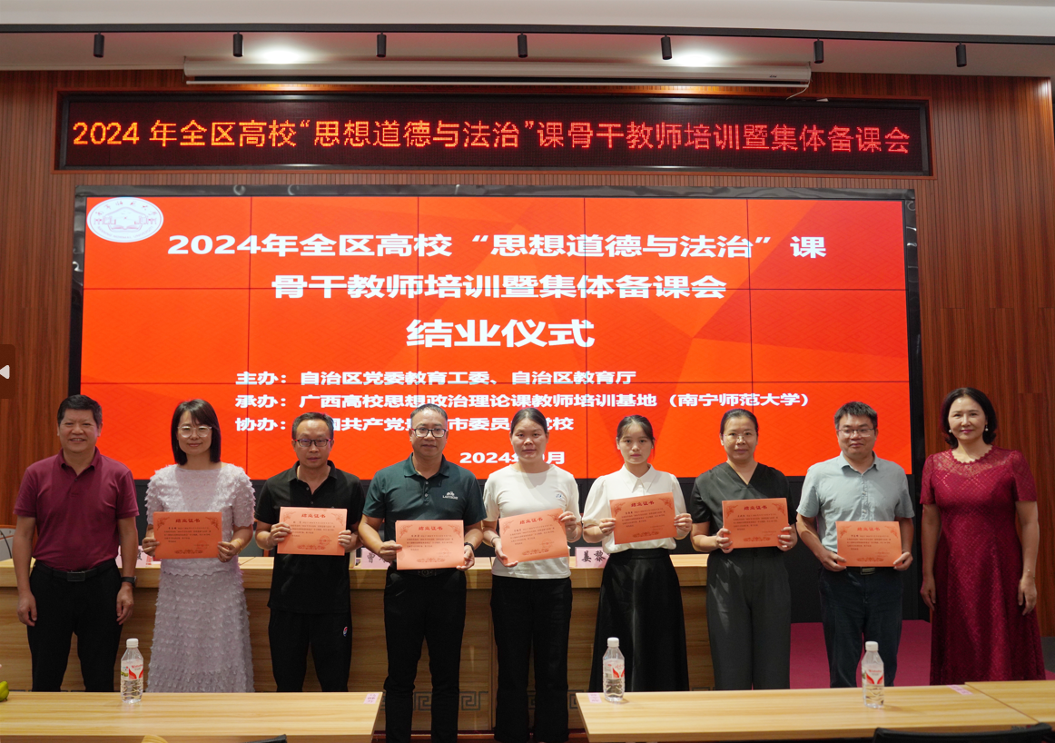 经过为期5天紧张有序的学习培训,本次培训暨集体备课会圆满完成各项任务。在结业仪式上,广西高校“思想道德与法治”分教学指导委员会主任委员曾令辉教授对此次培训暨集体备课会提出了期望。一是希望全体骨干教师向本次授课专家教授学习,学习专家老师们对“思想道德与法治”课的教学情怀和育人智慧。要从全区高校“思想道德与法治”课教师队伍当中培养出更多优秀教师来传承此门课程。二是全体骨干教师要思考自己要成为什么样的好老师、怎么样上好每一节有思想、有温度、有深度的蕴含塑造人生价值的思政课,既要用党和国家的教育理念思想去破解在现实教育中各种难题,又要从现实的各种教育问题中研究、提炼和总结,上升为自己独特的教育方法理念,自觉担当起“为党育人、为国育才”的使命,不断增强使命感和责任感,共同推进新时代全区高校“思想道德与法治”课教学创新。