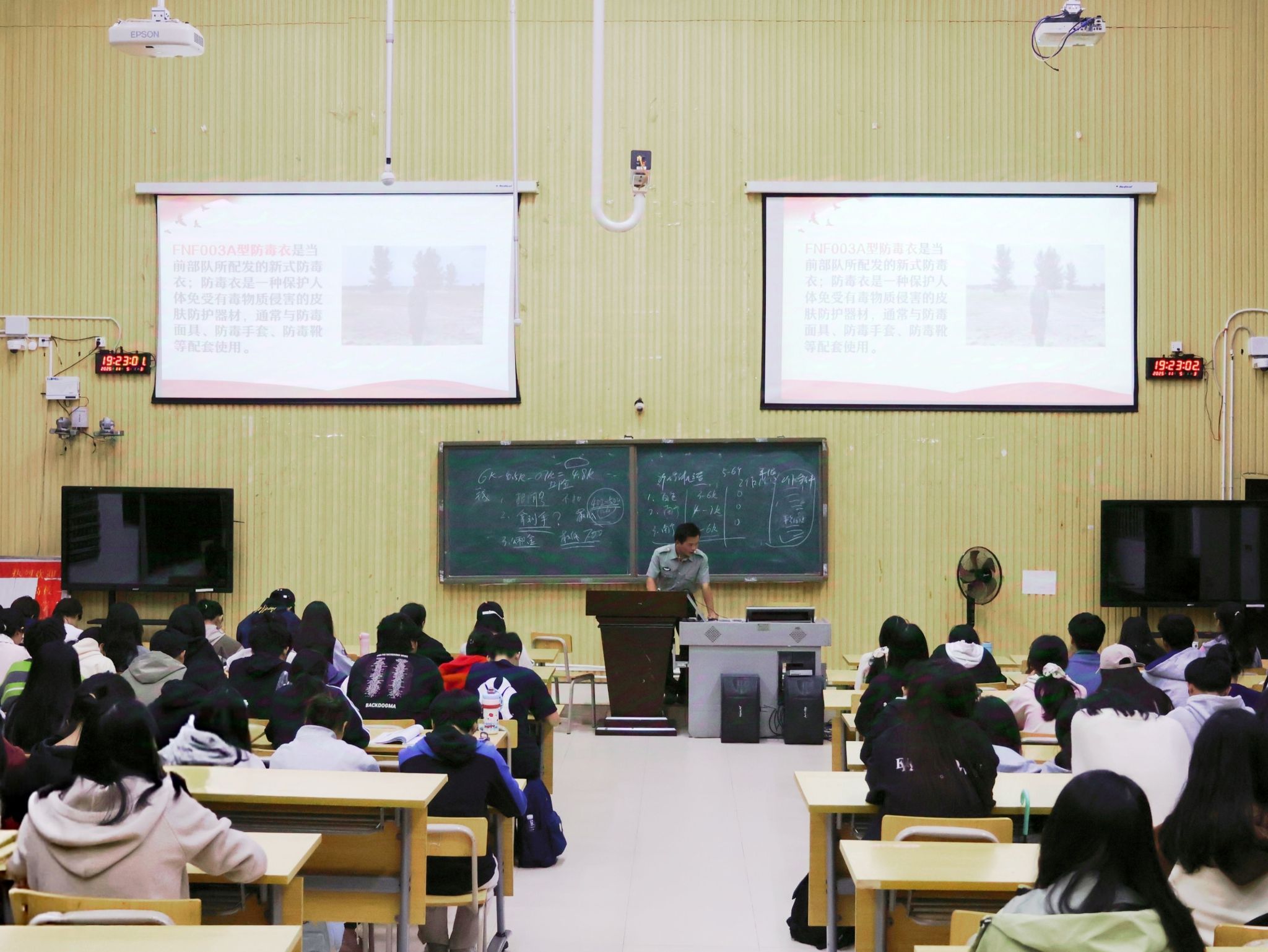讲座伊始,覃家俊同学结合自身服役经历,以“一种身份、一份岗位、一次蜕变、一次磨炼”为脉络,生动讲述了军旅生涯的成长与感悟。作为一名侦察兵,他始终以“情报大于生命”为座右铭,在艰苦训练中锤炼了坚定的意志品质。随后,他细致解读了退伍士兵在学业深造、就业创业等方面的政策支持,并分享了多位优秀退伍员工的发展路径。接着,钟宗川同学以退伍防化兵的身份,带大家走进“防化尖兵”的世界——从防化兵的历史由来与职能发展,到生化武器的危害及防护知识,他结合真实案例进行通俗讲解,让同学们对国防特殊兵种有了直观认知。他还分享了部队的日常训练与生活点滴,用真挚感受拉近了同学们与军旅生活的距离。最后,覃家俊同学通过互动问答的方式,现场解答了同学们关于年龄限制、专业适配性、心理准备等方面的疑问,气氛和谐而热烈。
