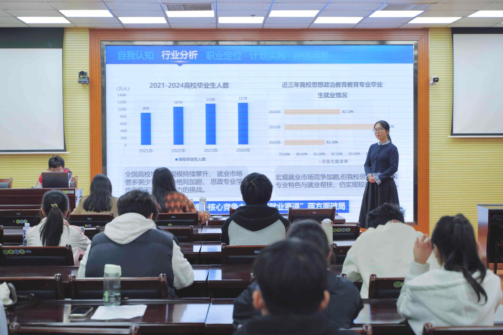 活动伊始,参赛选手依次登台,围绕自我分析、职业目标、实施路径等内容展开演讲,清晰的规划思路与饱满的青春热情,展现出新时代青年学子昂扬向上的精神风貌。接着,评委老师从内容逻辑、表达技巧、可行性等角度对选手表现进行细致点评,并给出针对性优化建议。