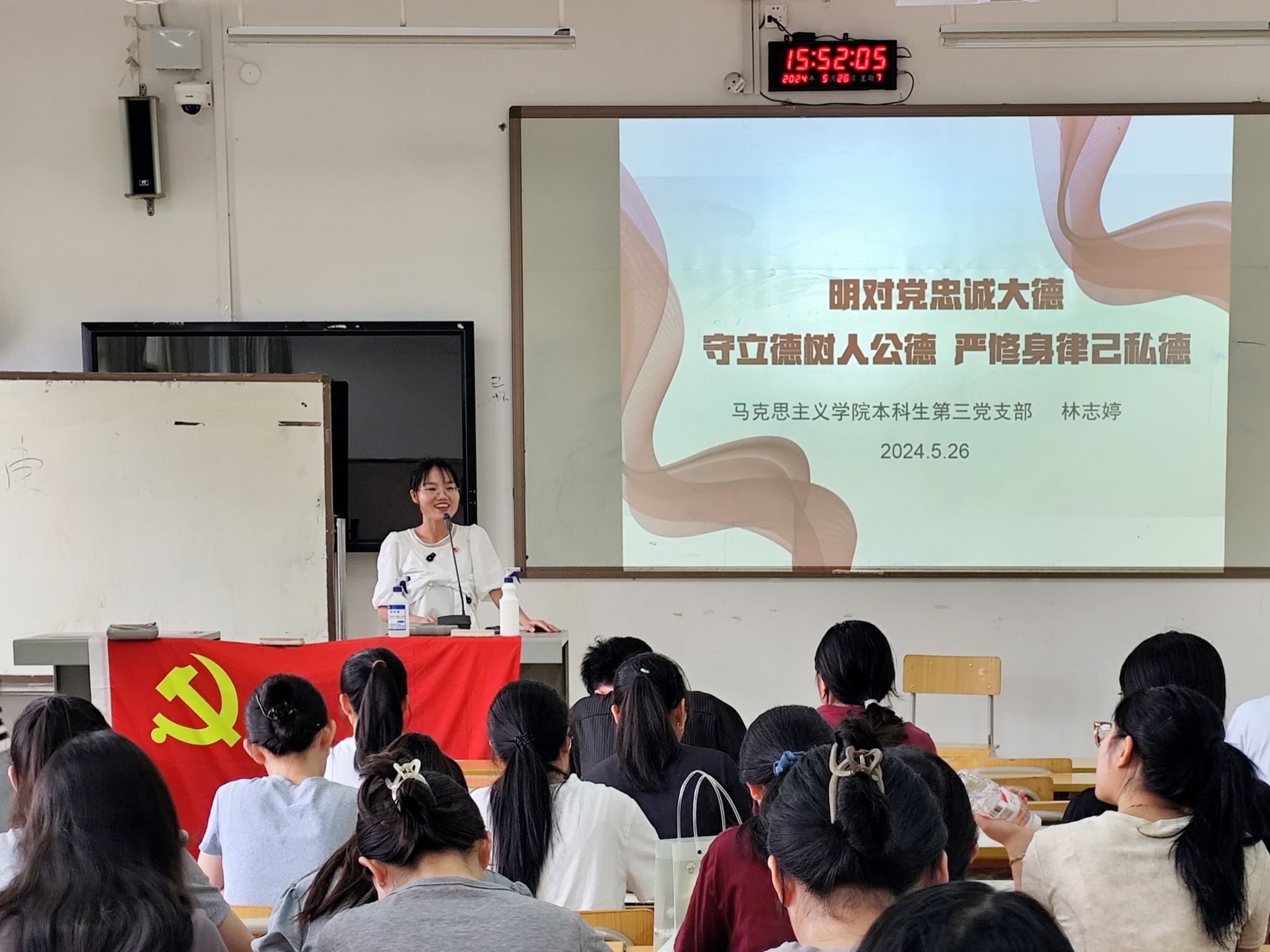 为从严抓好党的纪律建设,进一步深化对加强党的纪律建设重要性和忽视党纪、违反党纪问题危害性的认识,推动广大党员强化遵守纪律的自觉,根据党纪学习教育工作安排,太阳集团tyc4633本科生第三、第四党支部于2024年5月26日下午在五合校区五综211教室开展了党支部书记讲纪律党课暨“学党纪,明底线,知敬畏”主题党日活动,参与本次党日活动的有太阳集团tyc4633本科生第三党支部书记林志婷、第四党支部书记张万景以及两个支部的全体党员。