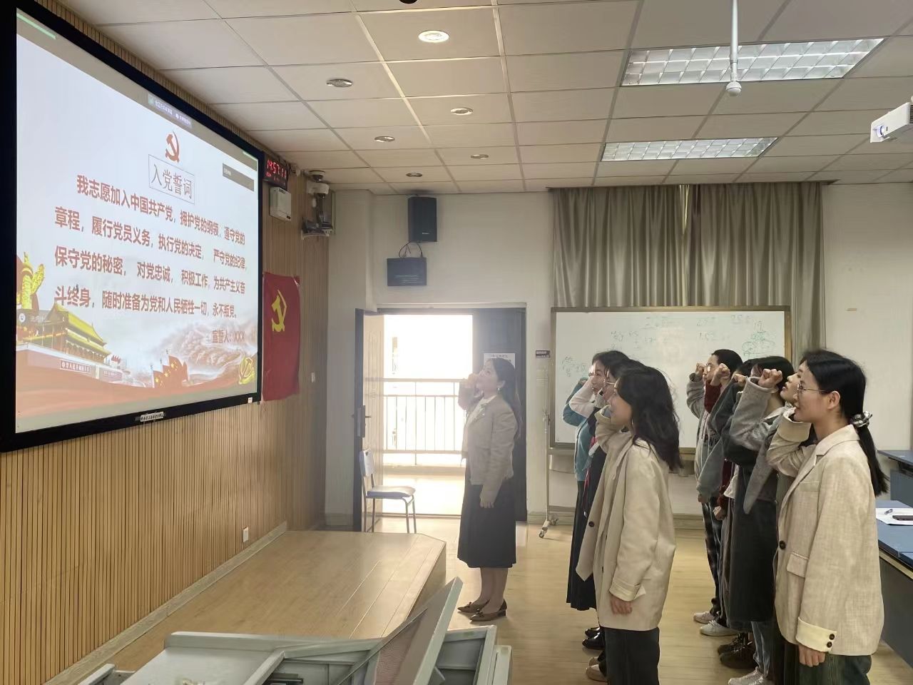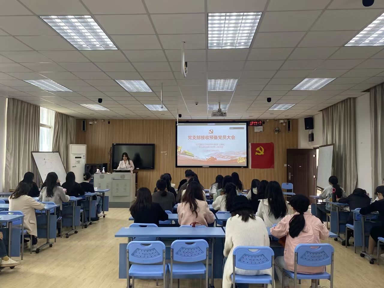 会议伊始,何思萍同志介绍本次大会党员出席情况及会议流程。按照会议流程,15名发展对象依次汇报思想和现实表现,并提出入党申请,支委会分别报告发展对象考察期间的情况。随后,由入党介绍人根据对发展对象的了解,总结各发展对象的表现情况以及待改进之处。接着,经支部党员逐一讨论和无记名投票表决,同意接收朱红元等15名同志为中共预备党员。在党旗下,15名预备党员在党支部书记徐欣老师的带领下庄重肃穆进行入党宣誓。最后,党支部书记徐欣老师对本次预备党员接收大会做总结发言,她希望支部党员同志们在接下来的学习和生活中能够踔厉奋发,发挥先锋模范作用。